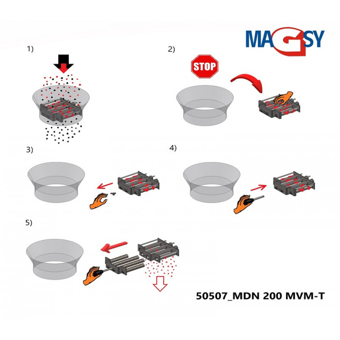 Atenție, în timpul curățării magnetului pentru buncăr este interzisă folosirea apei sub presiune sau imersia nucleelor magnetice. Se poate utiliza doar o cârpă uscată pentru curățare sau aer comprimat uscat pentru îndepărtarea resturilor de impurități metalice și a materialului separat.