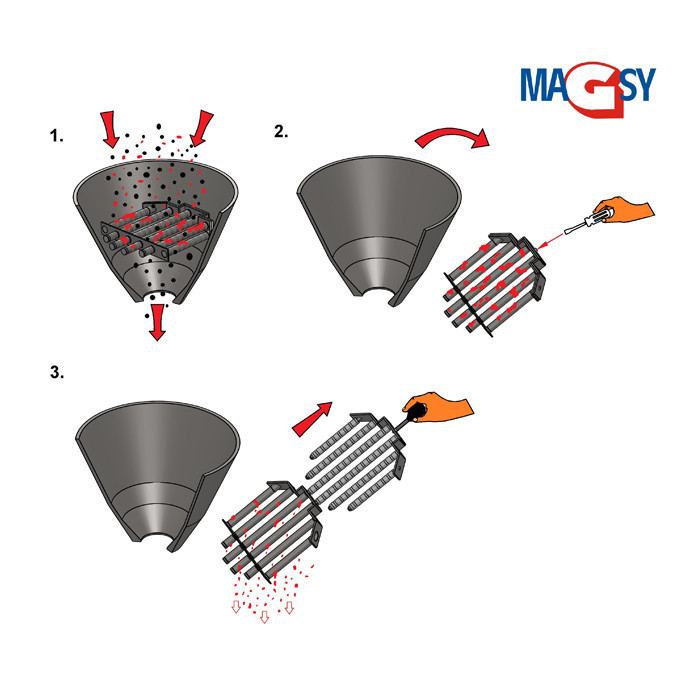 Pe magnetul pentru buncăr nu trebuie să cadă obiecte mai mari decât cele menționate (diametru maxim 3 mm, 3x3x3 mm), cu excepția impurităților feromagnetice descrise mai sus, care pot apărea întâmplător. În cazul în care vă temeți de prezența și a altor impurități, contaminanți, mai mari, este necesar să se monteze site cu ochiuri de maxim 3 mm, pentru a captura aceste obiecte nedorite înainte de intrarea pe magnetul pentru buncăr (după instalarea sitei, este necesar să se ia în considerare reducerea capacității de trecere, a fluxului, a magnetului pentru buncăr). Sita nu face parte din livrarea magnetului pentru buncăr. Atenție, materialul dumneavoastră poate conține o cantitate mare de impurități metalice fine (praf magnetic foarte fin, cu dimensiunea mai mică de 1 µm), care pot acoperi tuburile magnetice și bloca magnetul pentru buncăr (particulele fine magnetice atrag și materialul turnat, blocând întregul sistem). În același timp, forța magnetică/eficacitatea magnetului pentru buncăr se va reduce semnificativ. În cazul în care tuburile magnetice se acoperă imediat după pornirea fluxului de material prin magnetul pentru buncăr și întregul sistem se "ascunde" în praf de fier, aceasta nu este o defecțiune a magnetului pentru buncăr, ci este necesară întărirea separării magnetice cu un alt separator magnetic sau curățarea mai frecventă a magnetului pentru buncăr, materialul dumneavoastră conține probabil o cantitate foarte mare de particule feromagnetice.