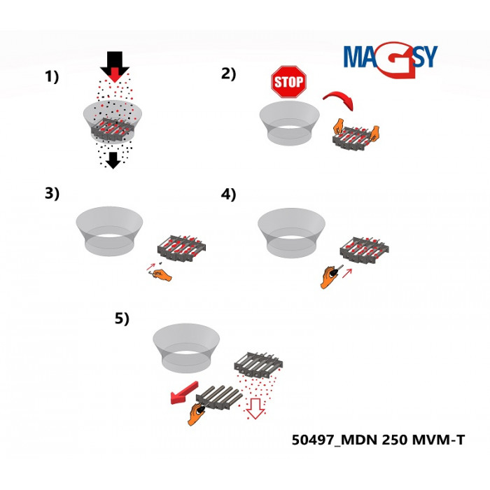 Pe magnetul pentru buncăr nu trebuie să cadă obiecte mai mari decât cele menționate (diametru maxim 3 mm, 3x3x3 mm), cu excepția impurităților feromagnetice descrise mai sus, care pot apărea întâmplător. În cazul în care vă temeți de prezența și a altor impurități, contaminanți, mai mari, este necesar să se monteze site cu ochiuri de maxim 3 mm, pentru a captura aceste obiecte nedorite înainte de intrarea pe magnetul pentru buncăr (după instalarea sitei, este necesar să se ia în considerare reducerea capacității de trecere, a fluxului, a magnetului pentru buncăr). Sita nu face parte din livrarea magnetului pentru buncăr. Atenție, materialul dumneavoastră poate conține o cantitate mare de impurități metalice fine (praf magnetic foarte fin, cu dimensiunea mai mică de 1 µm), care pot acoperi tuburile magnetice și bloca magnetul pentru buncăr (particulele fine magnetice atrag și materialul turnat, blocând întregul sistem). În același timp, forța magnetică/eficacitatea magnetului pentru buncăr se va reduce semnificativ. În cazul în care tuburile magnetice se acoperă imediat după pornirea fluxului de material prin magnetul pentru buncăr și întregul sistem se "ascunde" în praf de fier, aceasta nu este o defecțiune a magnetului pentru buncăr, ci este necesară întărirea separării magnetice cu un alt separator magnetic sau curățarea mai frecventă a magnetului pentru buncăr, materialul dumneavoastră conține probabil o cantitate foarte mare de particule feromagnetice.