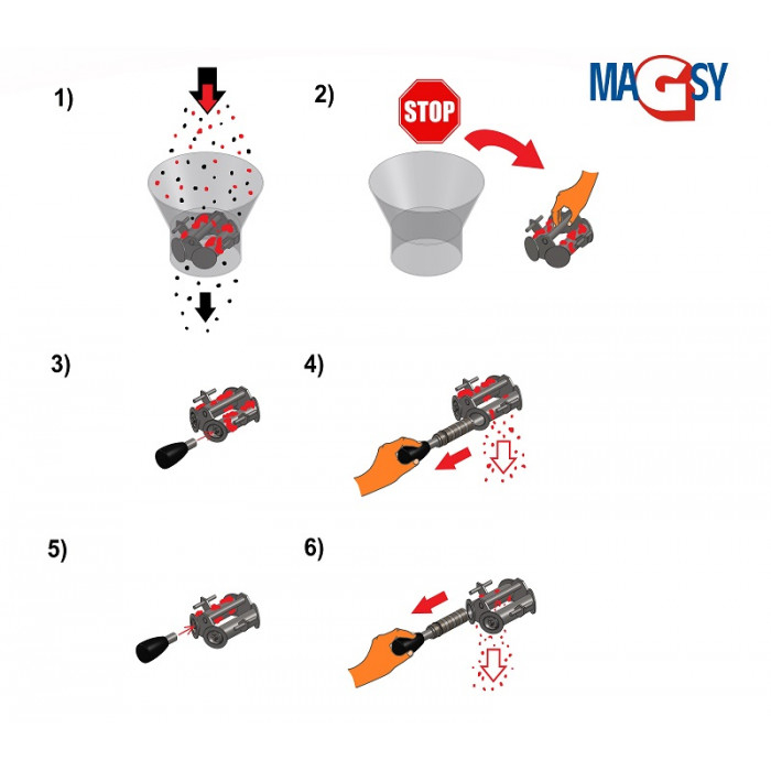 Atenție, în timpul curățării magnetului pentru buncăr este interzisă folosirea apei sub presiune sau imersia nucleelor magnetice. Se poate utiliza doar o cârpă uscată pentru curățare sau aer comprimat uscat pentru îndepărtarea resturilor de impurități metalice și a materialului separat.