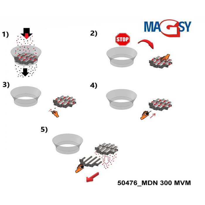 Pe magnetul pentru buncăr nu trebuie să cadă obiecte mai mari decât cele menționate (diametru maxim 3 mm, 3x3x3 mm), cu excepția impurităților feromagnetice descrise mai sus, care pot apărea întâmplător. În cazul în care vă temeți de prezența și a altor impurități, contaminanți, mai mari, este necesar să se monteze site cu ochiuri de maxim 3 mm, pentru a captura aceste obiecte nedorite înainte de intrarea pe magnetul pentru buncăr (după instalarea sitei, este necesar să se ia în considerare reducerea capacității de trecere, a fluxului, a magnetului pentru buncăr). Sita nu face parte din livrarea magnetului pentru buncăr. Atenție, materialul dumneavoastră poate conține o cantitate mare de impurități metalice fine (praf magnetic foarte fin, cu dimensiunea mai mică de 1 µm), care pot acoperi tuburile magnetice și bloca magnetul pentru buncăr (particulele fine magnetice atrag și materialul turnat, blocând întregul sistem). În același timp, forța magnetică/eficacitatea magnetului pentru buncăr se va reduce semnificativ. În cazul în care tuburile magnetice se acoperă imediat după pornirea fluxului de material prin magnetul pentru buncăr și întregul sistem se "ascunde" în praf de fier, aceasta nu este o defecțiune a magnetului pentru buncăr, ci este necesară întărirea separării magnetice cu un alt separator magnetic sau curățarea mai frecventă a magnetului pentru buncăr, materialul dumneavoastră conține probabil o cantitate foarte mare de particule feromagnetice.