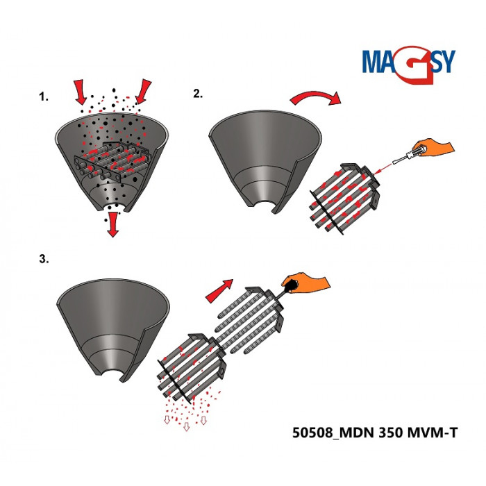 Pe magnetul pentru buncăr nu trebuie să cadă obiecte mai mari decât cele menționate (diametru maxim 3 mm, 3x3x3 mm), cu excepția impurităților feromagnetice descrise mai sus, care pot apărea întâmplător. În cazul în care vă temeți de prezența și a altor impurități, contaminanți, mai mari, este necesar să se monteze site cu ochiuri de maxim 3 mm, pentru a captura aceste obiecte nedorite înainte de intrarea pe magnetul pentru buncăr (după instalarea sitei, este necesar să se ia în considerare reducerea capacității de trecere, a fluxului, a magnetului pentru buncăr). Sita nu face parte din livrarea magnetului pentru buncăr. Atenție, materialul dumneavoastră poate conține o cantitate mare de impurități metalice fine (praf magnetic foarte fin, cu dimensiunea mai mică de 1 µm), care pot acoperi tuburile magnetice și bloca magnetul pentru buncăr (particulele fine magnetice atrag și materialul turnat, blocând întregul sistem). În același timp, forța magnetică/eficacitatea magnetului pentru buncăr se va reduce semnificativ. În cazul în care tuburile magnetice se acoperă imediat după pornirea fluxului de material prin magnetul pentru buncăr și întregul sistem se "ascunde" în praf de fier, aceasta nu este o defecțiune a magnetului pentru buncăr, ci este necesară întărirea separării magnetice cu un alt separator magnetic sau curățarea mai frecventă a magnetului pentru buncăr, materialul dumneavoastră conține probabil o cantitate foarte mare de particule feromagnetice.